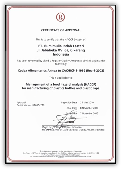 In 2014, Bumimulia was awarded the Food Safety System Certification 22000:2011 in manufacturing of rigid plastic packaging for food industry (bottle, cap and cup) which is the world’s leading certification for food management systems. This award shows our quality and seriousness toward food packaging as it is proved and certified internationally for its safety.